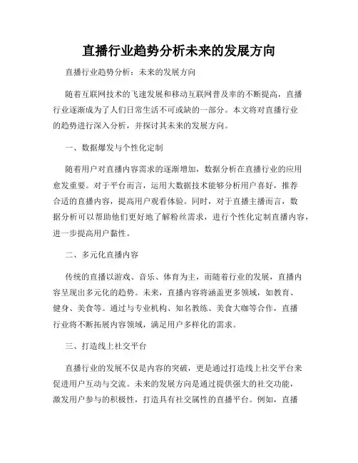 一、直播行业的发展趋势1. 移动直播将成为主流移动设备的普及和移动网络的发展,使得用户可以随时随地进行观看和发布直播。