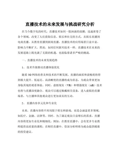 一、直播行业的发展趋势1. 高清视频技术的应用:随着网络带宽的提升和视频压缩技术的不断改进,高清视频的实时传输成为了可能。