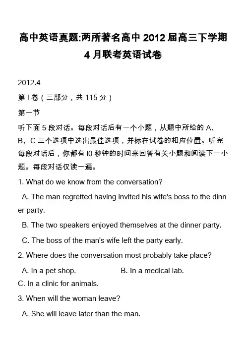 高中英语真题:两所著名高中2012届高三下学期4月联考英语试卷2012.4第I卷(三部分,共115分)第一节听下面5段对话。