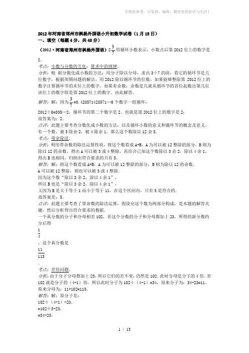 2012年1月18号枫杨外国语数学真题一、填空(每题4分,共40分) 1、273用循环小数表示,小数点后第2012位上的数字是 。