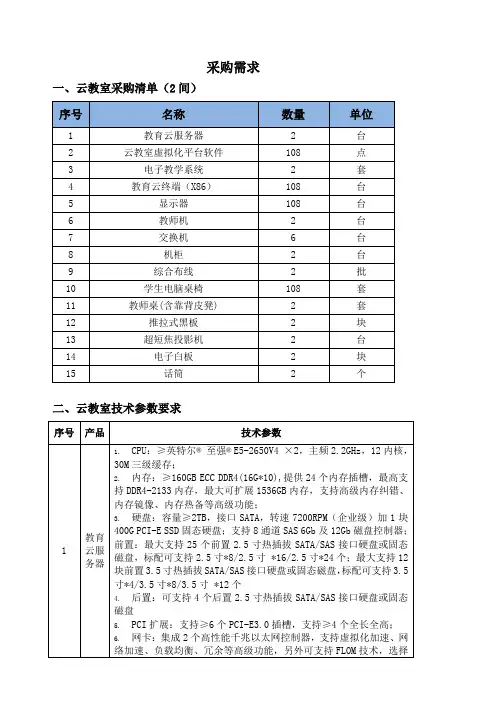 采购需求一、云教室采购清单(2间)二、云教室技术参数要求三、项目建设和说明1.产品运输、保险及保管1.1中标人负责产品到采购方指定的各校点的全部运输,包括装卸及现场搬运等。