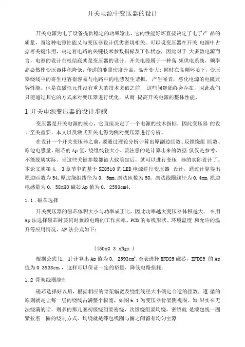 1开关电源变压器的设计步骤变压器是开关电源的核心,它直接决定了一个电源的技术指标,因此变压器的设计至关重要。