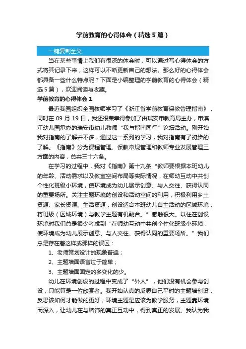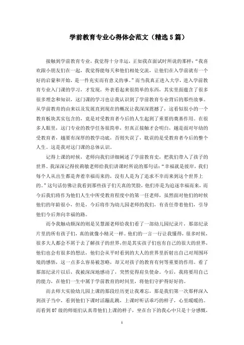 文档下载后可定制修改,请根据实际需要进行调整和使用,谢谢!并且,本店铺为大家提供各种类型的实用资料,如实习报告、述职报告、工作总结、工作计划、心得体会、演讲稿、作文大全、申请书、自我鉴定、其他资料等等,想了解不同资料格式和写法,敬请关注!Download tips: This document is carefully compiled by this editor.I hope that after you download it, it can help you solve practical problems. The document can be customized and modified after downloading, please adjust and use it according to actual needs, thank you!Moreover, our store provides various types of practical materials for everyone, such as internship reports, job reports, work summaries, work plans, reflections, speeches, essay summaries, application forms,self-evaluation, and other materials. If you want to learn about different data formats and writing methods, please stay tuned!学前教育心得优秀5篇在记录心得的时候,保证理性的分析,是十分重要的,出色的心得体会是我认识自己内心真实想法的有效方式,下面是本店铺为您分享的学前教育心得优秀5篇,感谢您的参阅。