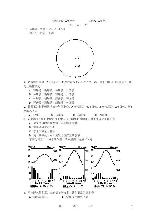 考试时间:100分钟总分:100分第 I 卷一、选择题(每题2分,共50分)读下图,回答1~3题1.若该图为南极(S)投影图,P点在昏线上,M点已经日落,则下列地点的昼长从长到短的正确排序为A.雅加达、新加坡、休斯敦、开普敦B.休斯敦、新加坡、雅加达、开普敦C.休斯敦、新加坡、开普敦、雅加达D.开普敦、雅加达、新加坡、休斯敦2.若图示为北半球某地的一气压中心,P点气压为1005百帕,M点气压为1000百帕,则M 点的风向为A.北风B.东北风C.东南风D.西南风3.若上题(2题)中所述气压中心位于印度北部地区,则下列现象正确的是A.尼罗河口海水盐度达一年中的最大值B.赞比西河进入汛期C.东北平原忙于播种D.黄土高原处于水土流失比较严重的季节下图为西亚三个城市的气温、降水量图。