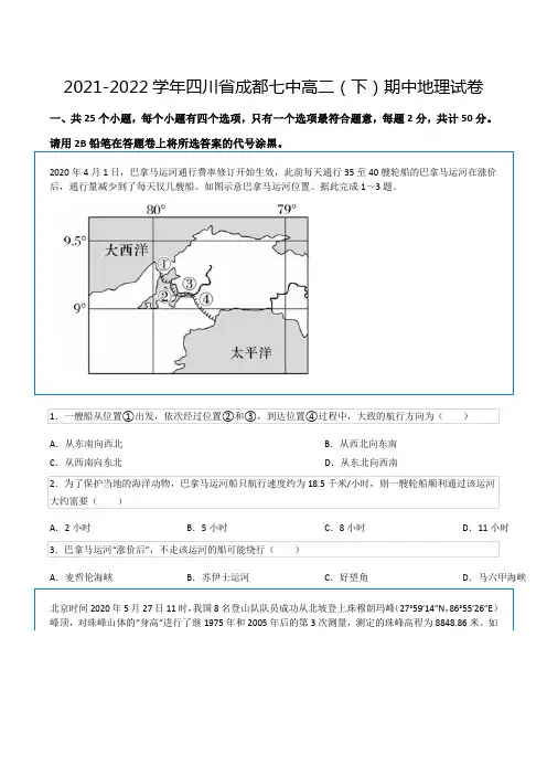2021-2022学年四川省成都七中高二(下)期中地理试卷一、共25个小题,每个小题有四个选项,只有一个选项最符合题意,每题2分,共计50分。