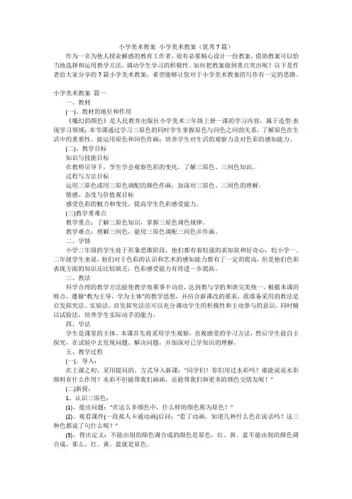 小学美术教案篇一一、教材(一)、教材的地位和作用《魔幻的颜色》是人民教育出版社小学美术三年级上册一课的学习内容,属于造型·表现学习领域;本节课通过学习三原色的同时学生掌握原色与间色之间的关系,了解原色在生活中的重要性,能运用原色和间色作画;培养学生对生活的观察力及对色彩的感知能力。