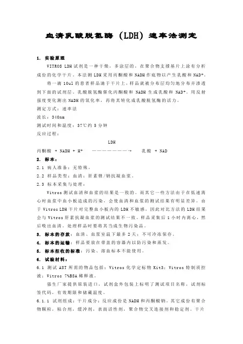 血清乳酸脱氢酶(LDH)速率法测定1. 实验原理VITROS LDH试剂是一种干燥,多涂层的,在聚合物支撑基片上涂有分析成份的化学干片。