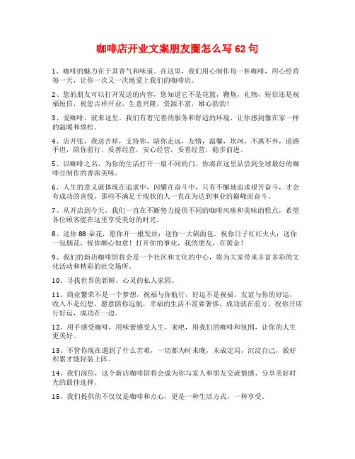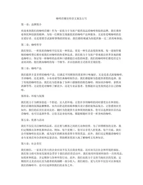 你喝咖啡吗?你爱喝咖啡吗?你喝咖啡是为了它的名字?还是为了喜欢它的味道?你喝咖啡是为了打发时光?还是真的在品尝着其中的味道?先别忙着回答我这个问题仔细想想然后你会有答案左岸人文情怀台湾奥美出品【统一左岸咖啡默剧篇】下午5点钟是咖啡馆生意最好的时候也是最吵的时候窗外一位默剧表演者正在表演上楼梯和下楼梯整个环境里只有他和我不必开口说话篇二:咖啡店广告宣传策划Youngcafecomingsoon广告宣传策划书一、市场背景喝咖啡是一种流行,同时喝咖啡也成了一种文化,一种情调和一种生活方式。