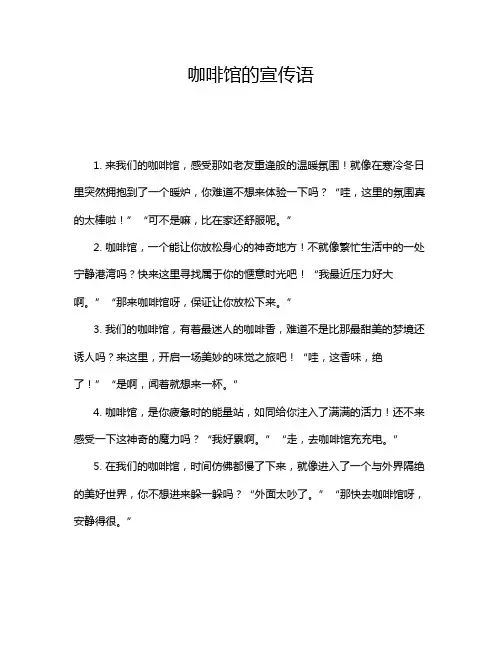 竭诚为您提供优质文档/双击可除咖啡馆试营业广告词篇一:咖啡广告词咖啡广告语左岸咖啡台湾奥美广告桥上恋人站着,桥下恋情流着,我呢,只是等着,你呢!好久不见你,我在左岸咖啡馆。