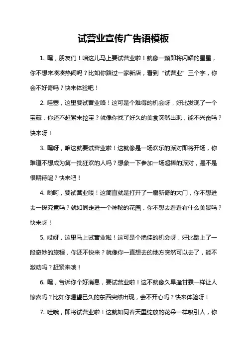 1. 嘿,朋友们!咱这儿马上要试营业啦!就像一颗即将闪耀的星星,你不想来凑凑热闹吗?比如你路过一家新店,看到“试营业”三个字,你会不好奇吗?快来体验吧!
