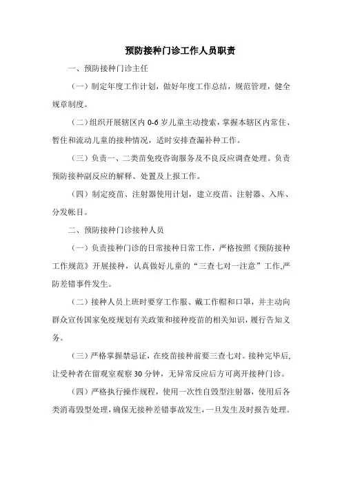 接种门诊岗位职责一、引言接种门诊作为疫苗接种的重要环节,担负着维护公众健康安全、预防疾病传播的重要责任。
