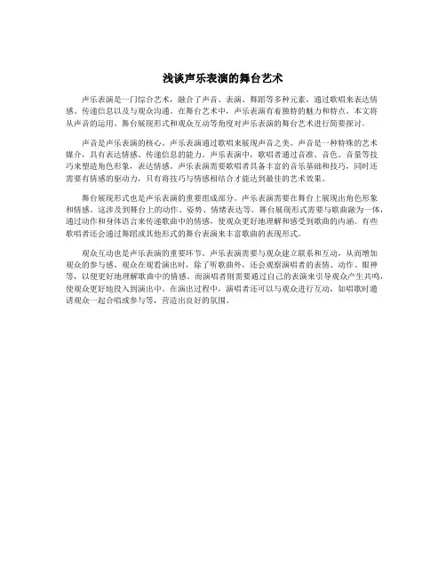 二、舞台表演艺术的情感表现(一)表演艺术的重要性声乐艺术是一门舞台表演艺术.演员在舞台上的一举一动,一个眼神一个动作以及个人心理活动,对他的演唱都有着很重要的影响。