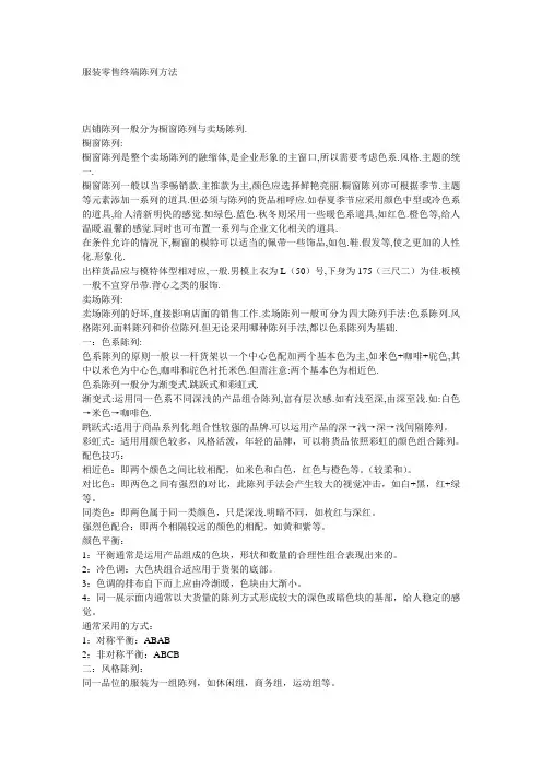 (播放的音乐标准-心须以节奏轻快的英文歌及儿歌)六、陈列技巧1、橱窗陈列1)突出当时公司要表达的主题思想2)配合当时天气的变化因而改变服装厚薄程度3)设定文打款式,突出配搭效果4)橱窗骨之货品确认齐色齐码并货量充足5)灯光、主题海报的配合6)橱窗的陈列经常保持清洁7)橱窗的陈列定期因货场及市场的变化而变化2、室内陈列营造视线焦点利用陈列帮具的摆放或货品的颜色摆放营造顾客的视线焦点,于视线焦点处放所想推广的货品,这样更能吸引顾客注意该项货品。