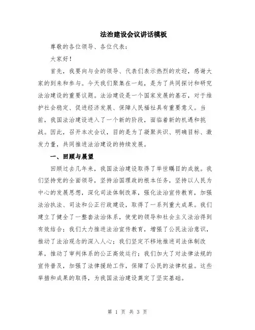 法治建设会议讲话模板尊敬的各位领导、各位代表:大家好!首先,我要向与会的领导、代表们表示热烈的欢迎,感谢大家的到来和参与。