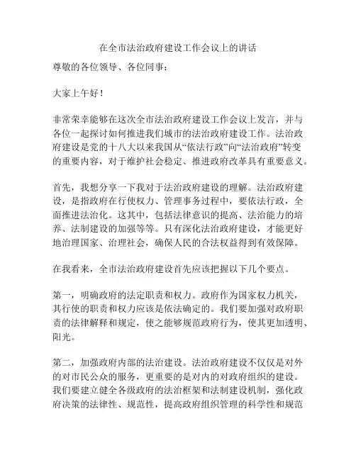 在法治政府建设工作会议上的讲话尊敬的领导、各位听众:大家好!今天,我非常荣幸能够在这次法治政府建设工作会议上发表讲话。