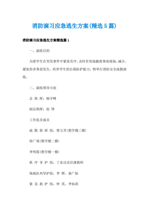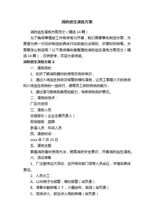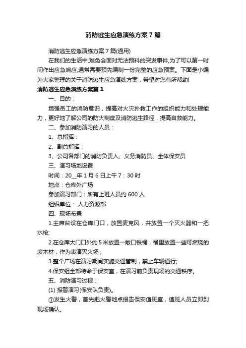 消防逃生应急演练方案7篇消防逃生应急演练方案7篇(通用)在我们的生活中,难免会面对无法预料的突发事件,为了可以第一时间作出应急响应,通常需要预先编制一份完整的应急预案。