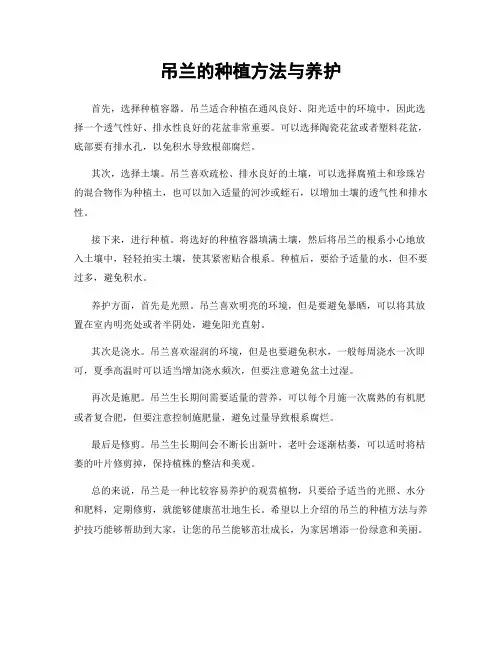二、阳光和温度的要求1.吊兰通常适合放在室内明亮的位置,以避免直接暴露在阳光下,避免蒸发过快和叶片变干。