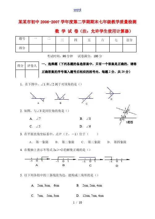 某某市初中2006-2007学年度第二学期期末七年级教学质量检测数 学 试 卷(注:允许学生使用计算器)考试时间:90分钟 试卷满分:100分一、选择题(下列各题的备选答案中,只有一个答案是正确的,请将 正确答案的序号填入题号后相应的括号内,每题2分,共20分)1.在下图中,∠1和∠2属于对顶角的是()2. 如图,与∠3是同位角的角是()A. ∠7B. ∠8C. ∠5D. ∠6 3. 在平面直角坐标系中,点P(2,-1)位于( )A. 第一象限 B. 第二象限 C. 第三象限 D. 第四象限 4. 在数轴上表示不等式2x ≥-2的解集正确的是()5. 以下列各组中的三条线段为边,能构成三角形的是() A. 2cm, 3cm, 6cm B. 2cm, 2cm, 4cmC. 7cm, 5cm, 3cmD. 12cm, 7cm, 4cm题号 一 二 三 四 五 六 七 总分 得分得分 评卷人A2121B21C21DBDCA10-110-1-10110-1下列图形中有6.稳定性的是()7. 已知a<b,下列四个不等式中不成立的是()A.4a<4b B.-4a>-4b C.a+4<b+4 D.3-a<3-b8. 奥运会需要用同一种形状的多边形瓷砖铺设无缝地面,购买的瓷砖形状不可能是A.正三角形;B.正方形;C.正五边形;D.正六边形()9. 用四根火柴棒摆成如图所示的象形“十”字,平移火柴棒后,原图形可以变成的象形文字或字母是()10. 将一长方形纸条,按如图所示的方法折叠,则∠1的度数是().°° C. 45°°得分评卷人二、填空题:(每题2分,共20分)11.的平方根是35±.12.如图,经过直线L 外一点B 画直线L 的垂线,这样的垂线能 画出 条.416x +的值为负数,则x 的取值为. ⎩⎨⎧==2y 1x 为解的二元一次方程为. 15.如图,与一个英文单词的字母顺序对应的有序数对分别为(5,2),(5,1),(1,1),(4,3),(7,2),你把这个英文单词写出来为. 16.估计2、3、320的大小,用“<”连接为. 17.如图所示,若∠2=∠1,∠3=105°,那么∠4的度数是. 72°,那么这个多边形的 对角线的条数为条.19.有一个数值转换器,原理如下:当输入的x 为4时,输出的y 是.20.在△ABC 中,有一点P 1,当P 1、A 、B 、C 没有任何三点在同一直线上时,可构成三个不重叠的小三角形(如图)。