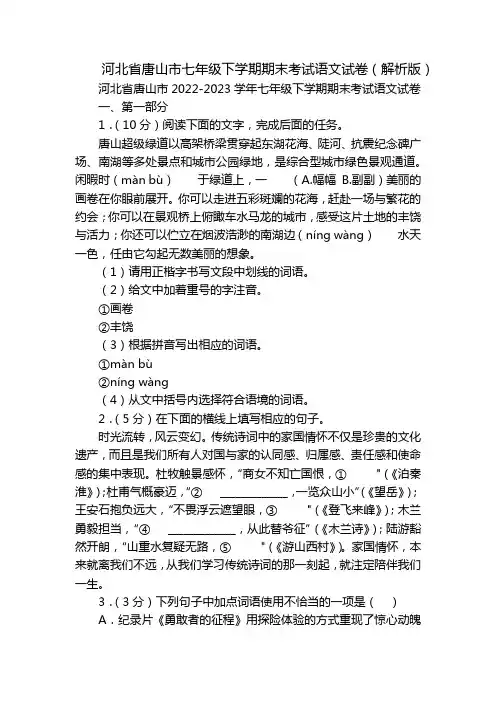 河北省唐山市七年级下学期期末考试语文试卷(解析版)河北省唐山市2022-2023学年七年级下学期期末考试语文试卷一、第一部分1.(10分)阅读下面的文字,完成后面的任务。