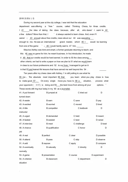 2018高考英语全国一卷完形填空精校精析2018高考英语全国一卷完形填空为记叙文,通过记叙作者参加一个叫Thinking Chess的学习课程,表现了课程给作者在以后的工作与生活带来的启发。