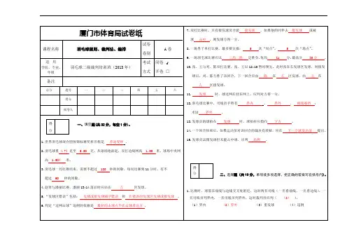 4.就下列成绩表计算所有名次,并把表格补充完整:(5分)1 2 3 4 5 胜次净胜名次1 2:0 1:2 2:0 2:13 7-3=422 0:2 0:2 1:2 0:201-8=-753 2:1 2:0 1:2 2:0 3 7-3=414 0:2 2:1 2:1 2:1 3 6-5=135 1:2 2:0 0:2 1:2 1 4-6=-245.这是一场男子团体赛的双打比赛,由福建的郭振东、洪炜对江苏的蔡赟、徐晨。