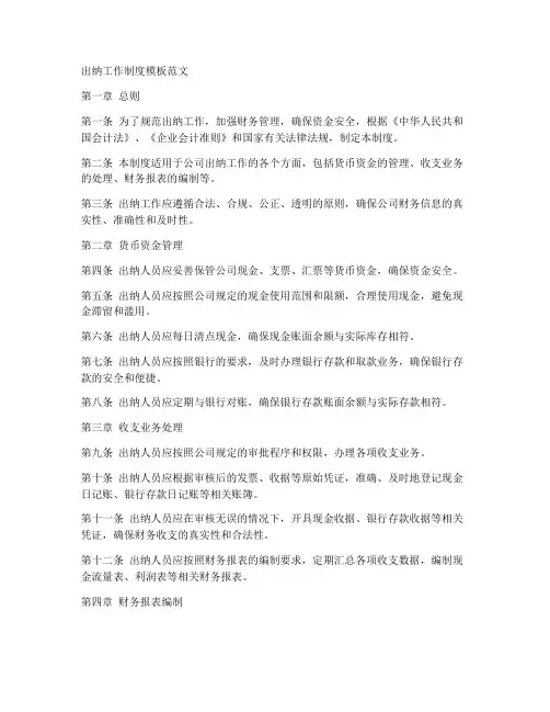 第1篇第一章总则第一条为加强公司财务管理工作,确保公司资金安全,规范出纳岗位的操作流程,特制定本规定。