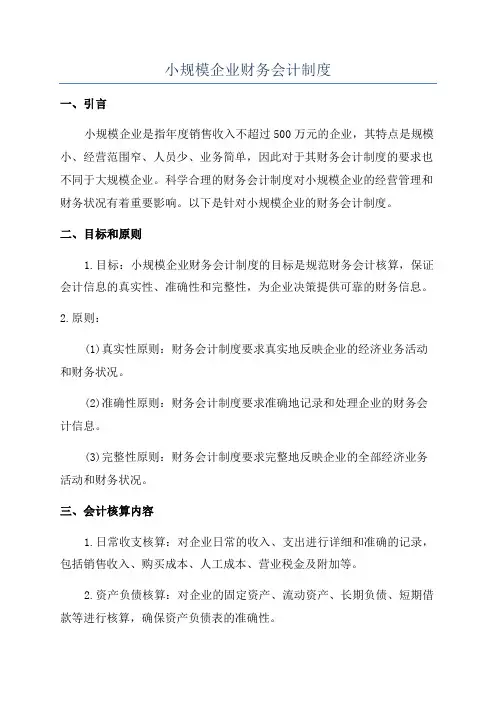 小企业财务会计制度及核算办法小微企业会计制度一、财务会计制度的概述小企业财务会计制度是为了规范小企业的财务会计管理而制定的一套制度规定和操作方法。