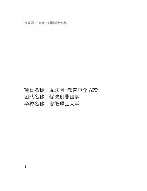 “互联网+”大学生创新创业大赛项目名称:互联网+教育中介APP 团队名称:优教创业团队学校名称:安徽理工大学1“互联网+”大学生创新创业大赛一、公司概述 ............................................................................. (4)1.1、社会背景 ...........................................................................41.2、产品概述 ...........................................................................5二、市场分析及定位 (6)2.1、竞争对手的分析 (6)2.2、网络技术发展 (6)2.3、市场环境的分析 (7)2.4、我们的优势 (9)2.5、产品定位 .........................................................................10三、产品介绍 ............................................................................. (11)3.1、产品功能 .........................................................................113.2、产品特点 .........................................................................153.3、盈利模式介绍 (15)四、商业模式 ............................................................................. . (16)4.1、商业模式的由来 (16)4.2、商业模式的具体结构 (17)五、营销策略 ............................................................................. . (18)5.1、此款APP的优势 (18)5.2、 APP推广模式 (19)六、财务分析 ............................................................................. (22)6.1、资金来源 .........................................................................226.2、成本规划 ........................................................................232“互联网+”大学生创新创业大赛6.3、赢利项目 (24)6.4 、收入预期 (25)6.5、收益预测 .........................................................................25七、团队介绍 ............................................................................. . (27)7.1、团队组织分工结构 (27)7.2、团队结构 (29)3“互联网+”大学生创新创业大赛一、公司概述1.1、社会背景在移动互联网高速发展时期,APP软件开发已然是时代发展的必然趋势,众企业纷纷睁开慧眼将目光聚焦在APP营销上,另一方面也是移动智能化年代的必然。