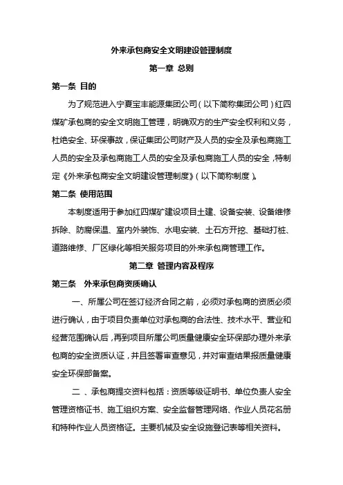 外来承包商安全文明建设管理制度第一章总则第一条目的为了规范进入宁夏宝丰能源集团公司(以下简称集团公司)红四煤矿承包商的安全文明施工管理,明确双方的生产安全权利和义务,杜绝安全、环保事故,保证集团公司财产及人员的安全及承包商施工人员的安全及承包商施工人员的安全及承包商施工人员的安全,特制定《外来承包商安全文明建设管理制度》(以下简称制度)。