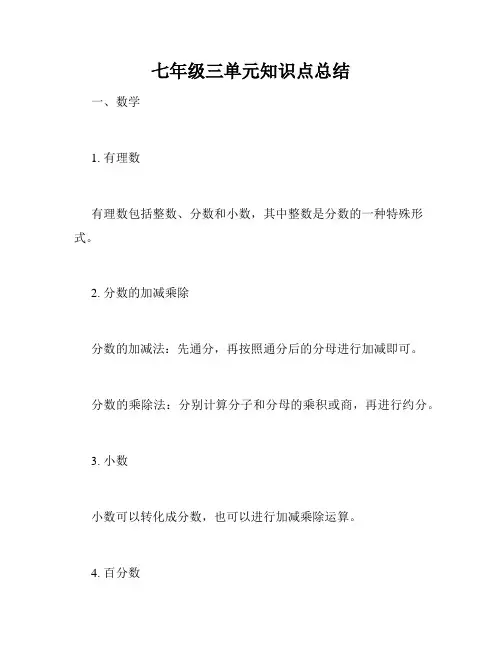 2. 分数:分数也是数学中的重要概念,七年级中,我们需要掌握分数的加减乘除,特别是分式加减法的运算方法。