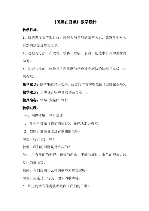 《田野在召唤》教学过程:一、导入谈话引课题:师:同学们,春天是个万物复苏、充满生机的季节,老师知道你们春天最喜欢做一件事就是“春游”,谁能说说你们都去哪里春游啊?植物园、公园…二、新授歌曲1.师:你们去春游的时候一定很快乐、很开心吧!老师为大家带来一段演出的视频,意大利民歌《田野在召唤》,请同学们欣赏。