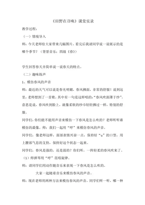 《田野在召唤》课堂实录教学过程:(一)情境导入师:今天老师给大家带来几幅图片,看完后我请同学说一说展示的是哪个季节?(背景音乐:四级《春》)学生回答春天并简单说一说春天的特点。