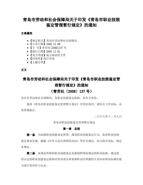 青岛市劳动和社会保障局关于印发《青岛市职业技能鉴定管理暂行规定》的通知文章属性•【制定机关】青岛市劳动和社会保障局•【公布日期】2008.12.09•【字号】青劳社[2008]137号•【施行日期】2008.12.01•【效力等级】地方规范性文件•【时效性】现行有效•【主题分类】正文青岛市劳动和社会保障局关于印发《青岛市职业技能鉴定管理暂行规定》的通知(青劳社〔2008〕137号)各区市劳动和社会保障局,各职业技能鉴定机构,各有关单位:现将《青岛市职业技能鉴定管理暂行规定》印发给你们,请结合工作实际,认真贯彻执行。