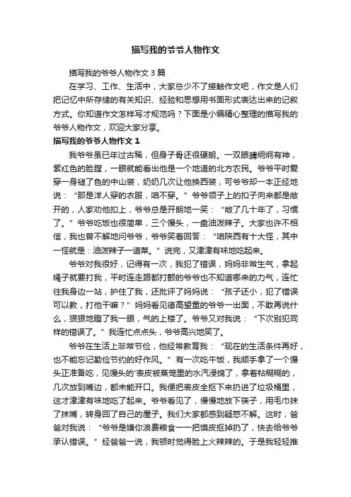 描写我的爷爷人物作文描写我的爷爷人物作文3篇在学习、工作、生活中,大家总少不了接触作文吧,作文是人们把记忆中所存储的有关知识、经验和思想用书面形式表达出来的记叙方式。