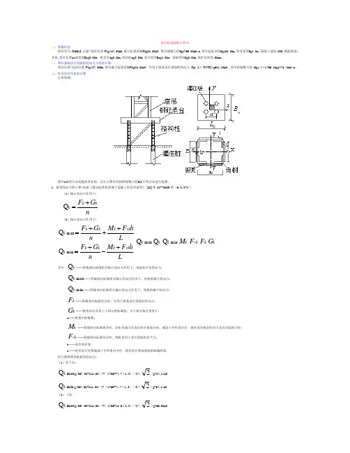 1. 桩顶竖向力的计算(依据《塔式起重机混凝土基础工程技术规程》(JGJ/T 187-2009)的(6.3.2-1))(1)轴心竖向力作用下:nG F kk k +=Q(2)偏心竖向力作用下:LhF M nG F L hF M nG F vk k kk k vk k kk k +-+=+++=min max Q Q max Q k k Q min Q k k M vk F k F kG式中k Q ──荷载效应标准组合轴心竖向力作用下,基桩的平均竖向力;max Q k ──荷载效应标准组合偏心竖向力作用下,角桩的最大竖向力;minQ k ──荷载效应标准组合偏心竖向力作用下,角桩的最小竖向力;k F ──荷载效应标准组合时,作用于桩基承台顶面的竖向力;k G ──桩基承台及其上土的自重标准值,水下部分按浮重度计;n ──桩基中的桩数; k M ──荷载效应标准组合时,沿矩形或方形承台的对角线方向,或沿十字形承台任一条形承台纵向作用于承台顶面的力矩;vkF ──荷载效应标准组合时,塔机作用于承台顶面的水平力;h ──承台的高度;L ──矩形承台对角线或十字形承台中任一条形承台两端基桩的轴线距离。