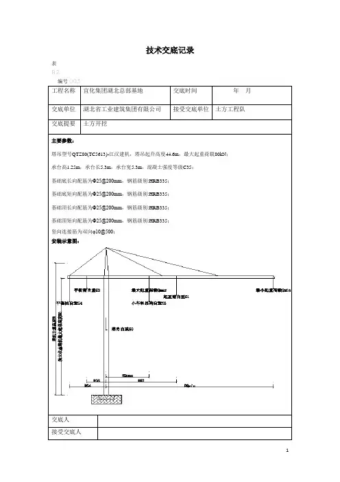 QTZ80(TC5613)自升塔式起重机基础施工方案目录第一章工程概况 (2)第一节项目概况 (2)第二节塔吊选型 (2)第二章塔机基础的设计及制作 (2)第一节塔吊位置选择 (2)第二节塔吊基础设计 (3)一、桩基承载力特征值估算及有关岩土设计参数 (3)二、塔吊基础设计 (5)第三节塔吊基脚螺栓预埋 (5)第四节塔吊基础的防雷接地引接 (5)第五节塔吊基础与底板接头处理 (5)第六节塔吊立架处与地下室顶板主、次梁接头处理 (6)第七节地下室顶板预留孔洞围护 (6)QTZ5014塔吊桩基础的计算书 (6)附图 (12)第一章工程概况第一节编制依据本方案主要依据施工图纸及以下规范及参考文献编制《塔式起重机设计规范》(GBT13752-1992)《地基基础设计规范》(GB50007-2002)《建筑结构荷载规范》(GB50009-2001)《建筑安全检查标准》JGJ59-99 《混凝土结构设计规范》(GB50010-2002)《建筑桩基技术规范》JGJ94-94第一节项目概况本项目为****项目一期5#楼,由****房地产开发有限公司投资兴建,广东**建筑设计院有限公司设计,广东**建设监理公司监理,黑龙江省***工程公司安徽分公司承建,广东**建筑设计院勘察。