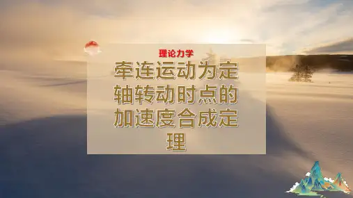 解:1. 运动分析动点:CD上的C点;动系:固连于AB杆于是三种运动分别为:绝对运动:C点的上下直线运动;相对运动:C点沿AB直线运动;牵连运动:随AB杆铅垂平面内曲线平移2.加速度分析:其中由于动系作平移,故动系AB杆上各点的加速度相同,因此动系AB杆上与动点套筒C相重合点C1的加速度即牵连加速度,如下图所示,则:由平行四边形法则,得二.牵连运动为转动时点的加速度合成定理当牵连运动为转动时,加速度合成定理与牵连运动为平移时所得到的结果是不相同的。