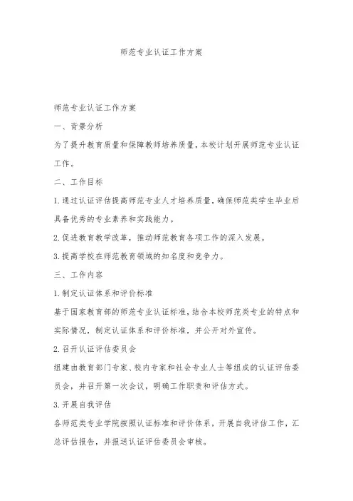 师范认证实施方案为了提高教师教育质量,促进师范教育的发展,我校制定了师范认证实施方案,旨在推动教师教育教学改革,提升师范教育质量,培养高素质的教师队伍,以下是具体方案内容:一、认证标准。