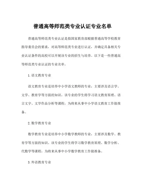 普通高等师范类专业认证专业名单普通高等师范类专业认证是指国家教育部根据普通高等学校教育指导委员会的要求,对高等师范类专业进行认证,并确定具备相关专业认证条件的高校可以开展该专业的招生与培养。