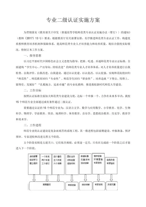 专业二级认证实施方案为贯彻落实《教育部关于印发〈普通高等学校师范类专业认证实施办法(暂行)〉的通知》(教师(2017)13号)要求,根据教育厅有关部署安排,有序推进师范类专业认证工作,构建优质教师教育培养机制和保障体系,提高师范类专业人才培养能力和培养质量,现结合我校实际情况,特制订本工作方案。