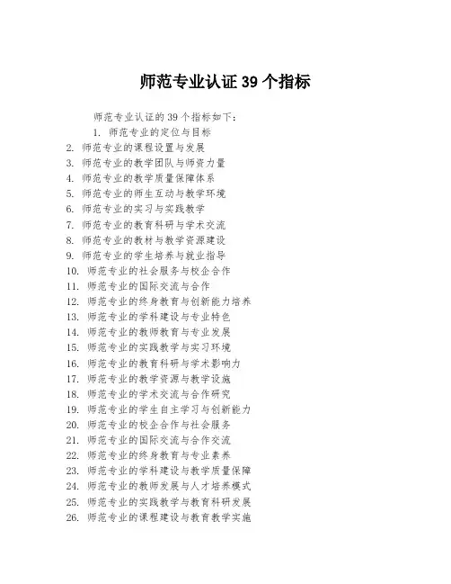 师范专业认证39个指标师范专业认证的39个指标如下:1. 师范专业的定位与目标2. 师范专业的课程设置与发展3. 师范专业的教学团队与师资力量4. 师范专业的教学质量保障体系5. 师范专业的师生互动与教学环境6. 师范专业的实习与实践教学7. 师范专业的教育科研与学术交流8. 师范专业的教材与教学资源建设9. 师范专业的学生培养与就业指导10. 师范专业的社会服务与校企合作11. 师范专业的国际交流与合作12. 师范专业的终身教育与创新能力培养13. 师范专业的学科建设与专业特色14. 师范专业的教师教育与专业发展15. 师范专业的实践教学与实习环境16. 师范专业的教育科研与学术影响力17. 师范专业的教学资源与教学设施18. 师范专业的学术交流与合作研究19. 师范专业的学生自主学习与创新能力20. 师范专业的校企合作与社会服务21. 师范专业的国际交流与合作交流22. 师范专业的终身教育与专业素养23. 师范专业的学科建设与教学质量保障24. 师范专业的教师发展与人才培养模式25. 师范专业的实践教学与教育科研发展26. 师范专业的课程建设与教育教学实施27. 师范专业的教学资源与信息技术支持28. 师范专业的学生发展与实践教育环境29. 师范专业的社会责任与大众教育服务30. 师范专业的国际合作与学术交流平台31. 师范专业的师德师风与教育事业发展32. 师范专业的评估与质量监控体系33. 师范专业的学科建设与专业发展计划34. 师范专业的教学实践与实习实践基地35. 师范专业的学生发展与培养模式36. 师范专业的校企合作与社会服务模式37. 师范专业的国际交流与学术合作计划38. 师范专业的师资队伍与教学团队建设39. 师范专业的教育教学改革与创新实践。