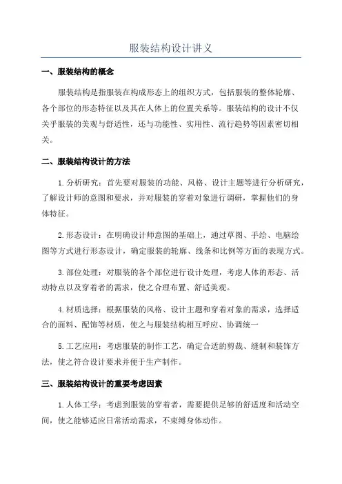 一、服装结构设计的基础知识1. 服装结构设计的概念:服装结构设计是指通过合理的剪裁、缝制和组合,使服装具备合适的形状、流线和可穿性。