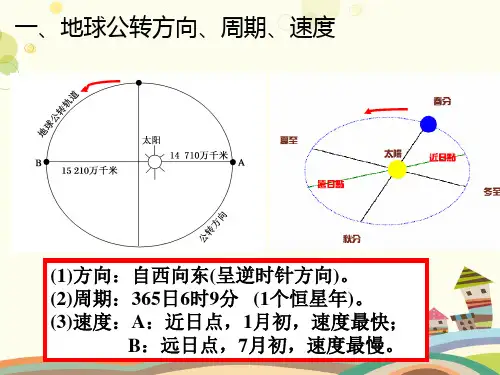 3. 地球公转的速度和方向地球公转的平均速度约为每秒30公里。
