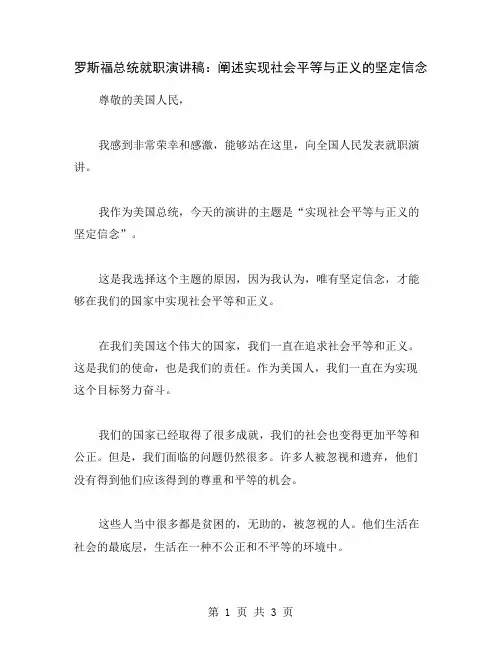 罗斯福总统就职演讲稿:阐述实现社会平等与正义的坚定信念尊敬的美国人民,我感到非常荣幸和感激,能够站在这里,向全国人民发表就职演讲。