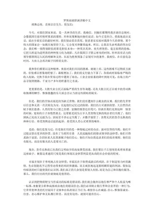 富兰克林罗斯福就职演讲篇一:罗斯福的首次就职演说美国总统罗斯福的首次就职演说1933年3月4日富兰克林罗斯福就任美国总统之时,美国正在遭受经济危机的沉重打击。
