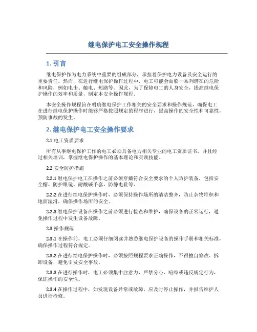 继电保护工种安全操作规程一、前言电力系统中的继电保护是防止电力系统中的设备、线路、变压器等因故障、异常状态等引发电力设备、人员等的安全保护工具。