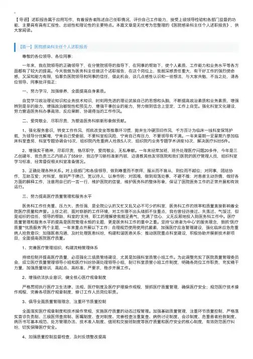 【篇⼀】医院感染科主任个⼈述职报告 尊敬的各位领导、各位同事: ⼀年来,我在院领导的正确领导下,在分管院领导的指导下,在同事的帮助下,使个⼈素质、⼯作能⼒和业务⽔平等各⽅⾯都有了较⼤的提⾼。