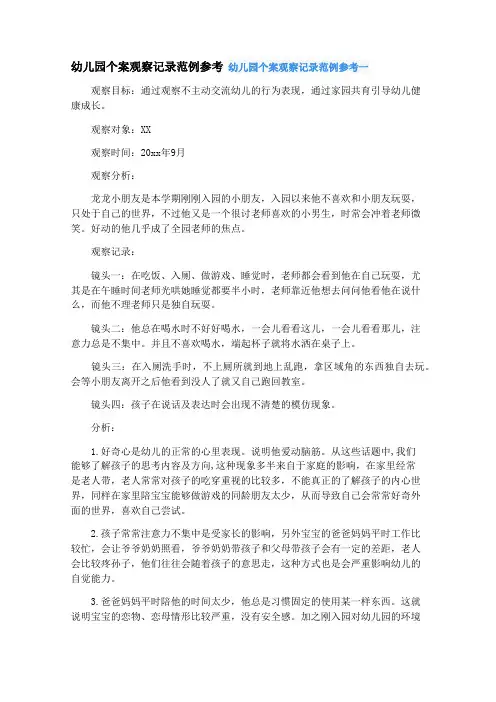 幼儿园个案观察记录范例参考幼儿园个案观察记录范例参考一观察目标:通过观察不主动交流幼儿的行为表现,通过家园共育引导幼儿健康成长。