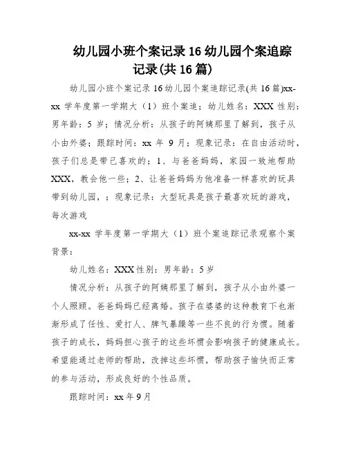 2012-2013学年度第一学期大(1)班个案追踪记录观察个案背景:幼儿姓名:徐xx性别:男年龄:5岁情况分析:从孩子的阿姨那里了解到,孩子从小由外婆一个人照顾。