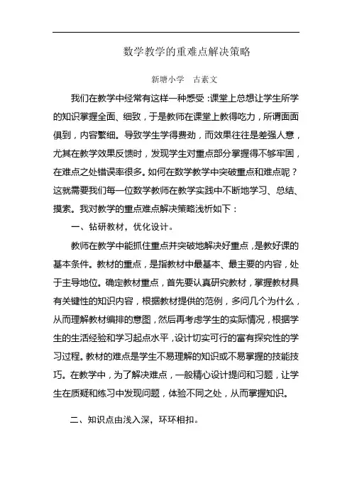小学数学教学中如何突破难点的解决方法关于小学数学教学中如何突破难点的解决方法大家在学习数学科目的过程中,还在苦苦寻找数学教学中解答难题的方法吗?下面是店铺为大家整理的小学数学教学中如何突破难点的解决方法,希望能够帮助到大家。